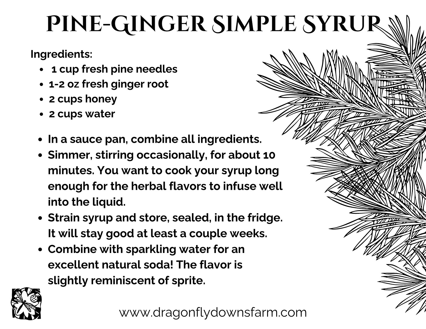 My favorite pine drink, however, starts with a basic simple syrup. Add soda water for a wonderful sprite-esque drink. Leave as-is, or add a little gin for a nice boozy spritzer. Using honey as the sweetener adds a pleasant note of complexity to the flavor without overpowering the pine itself. Ginger is also a lovely complement. It’s also, like all simple syrups, incredibly easy to make. Simply start with a generous handful (⅔ to 1 cup or so) of fresh, clean pine needles. In a sauce pan, combine the pine, an ounce of sliced gingerroot, 2 cups of honey, and 2 cups of water. Simmer for about 10 minutes, strain, and enjoy!